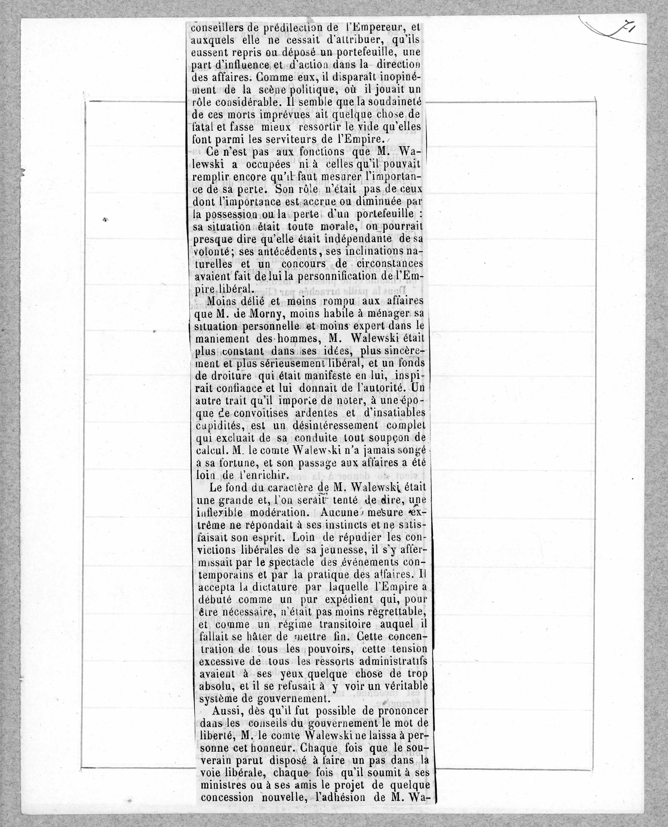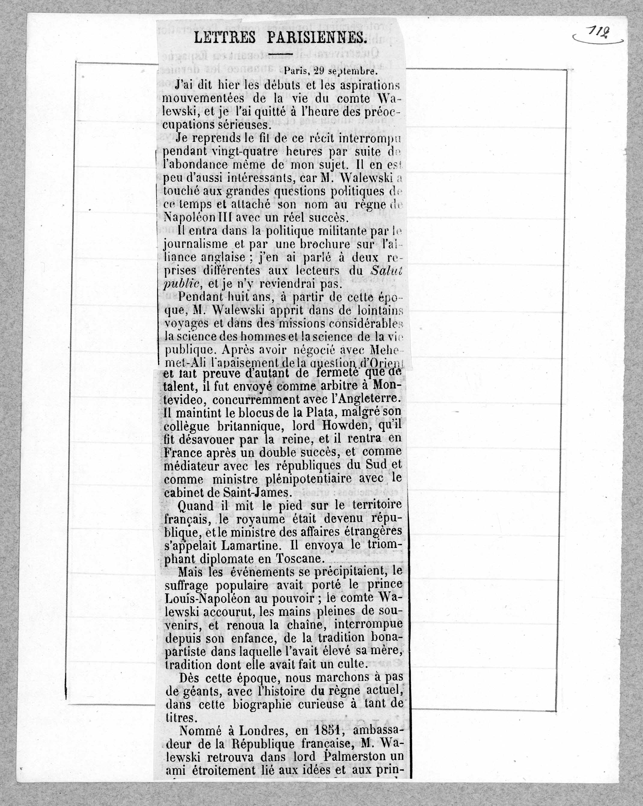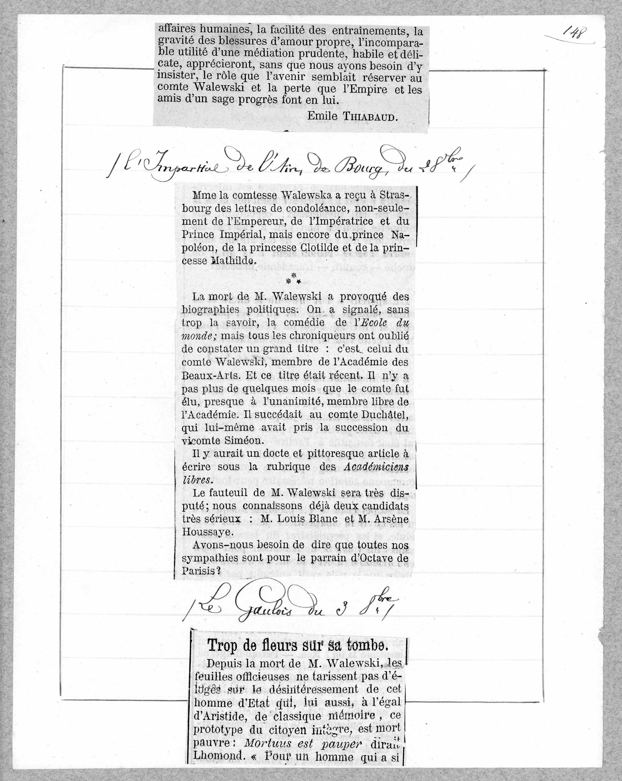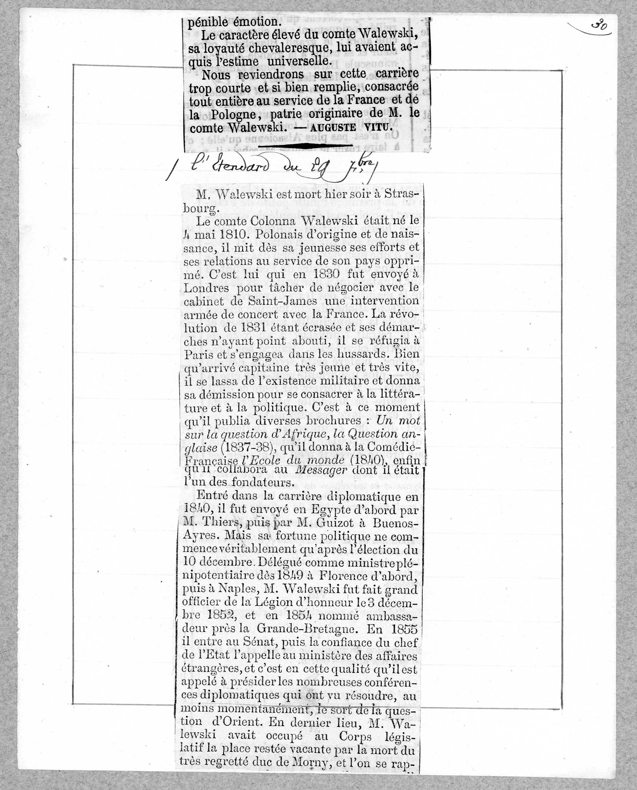 Revue de presse après le décès du Comte Colonna Walewski le 27 septembre 1868 à Strasbourg.