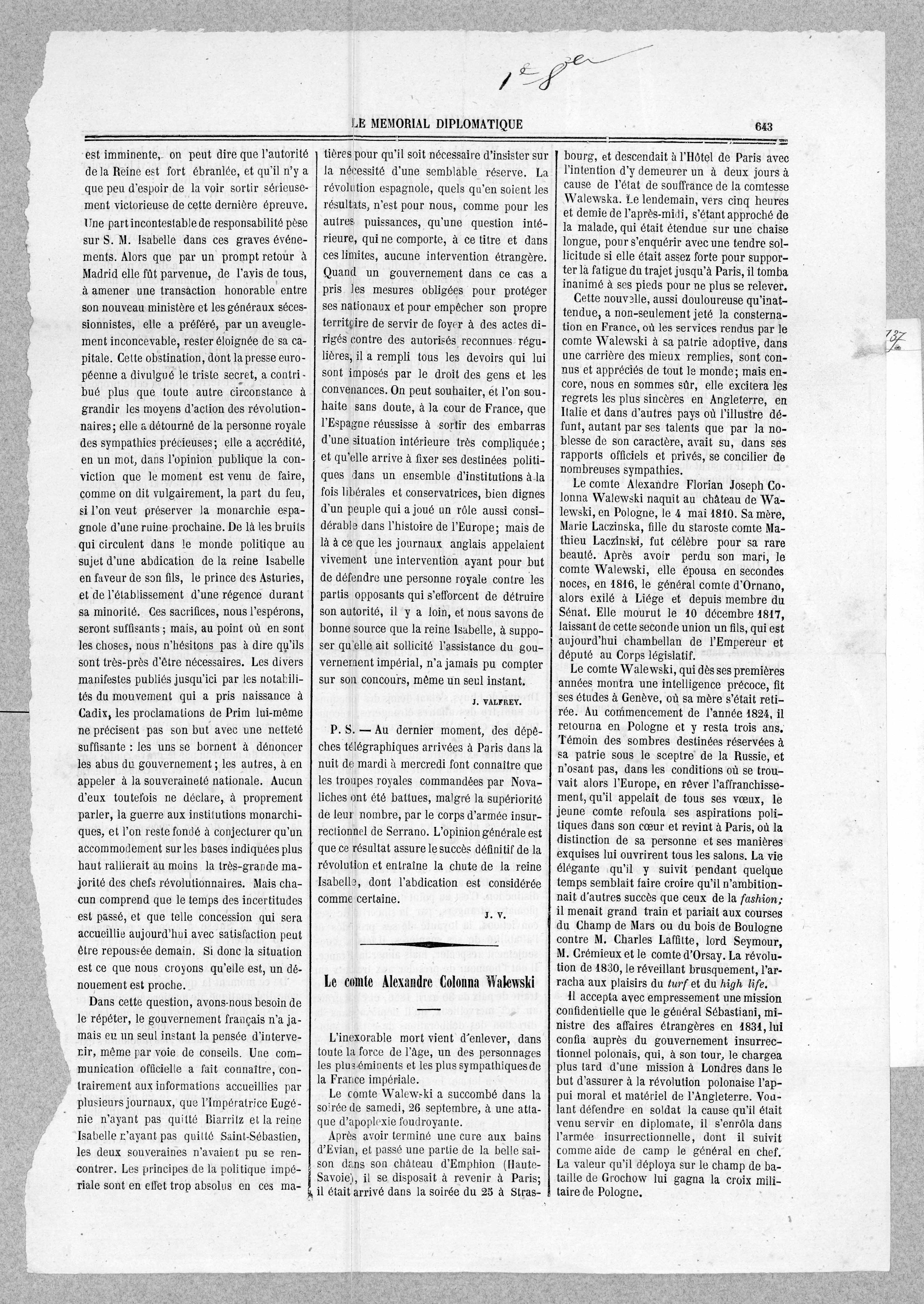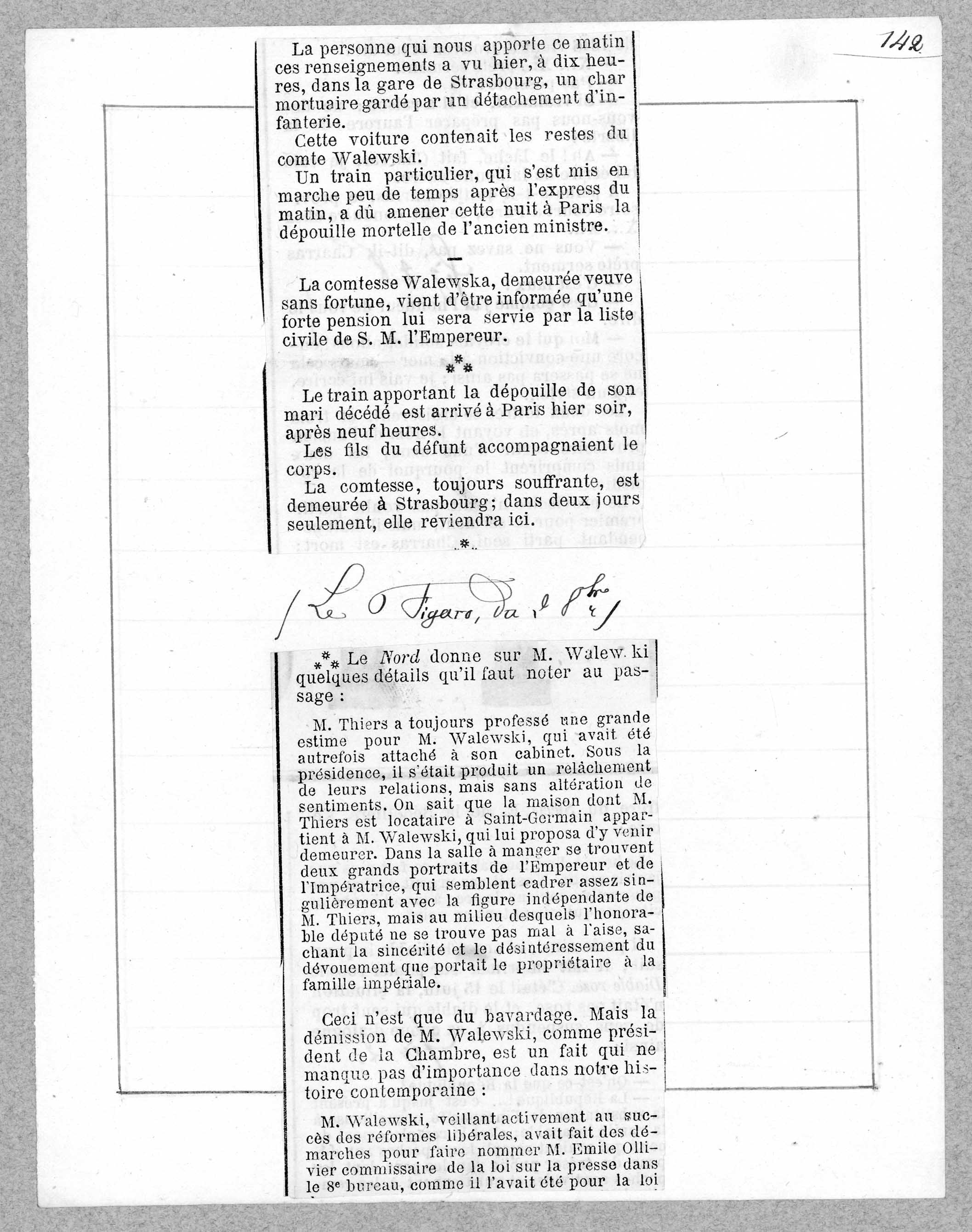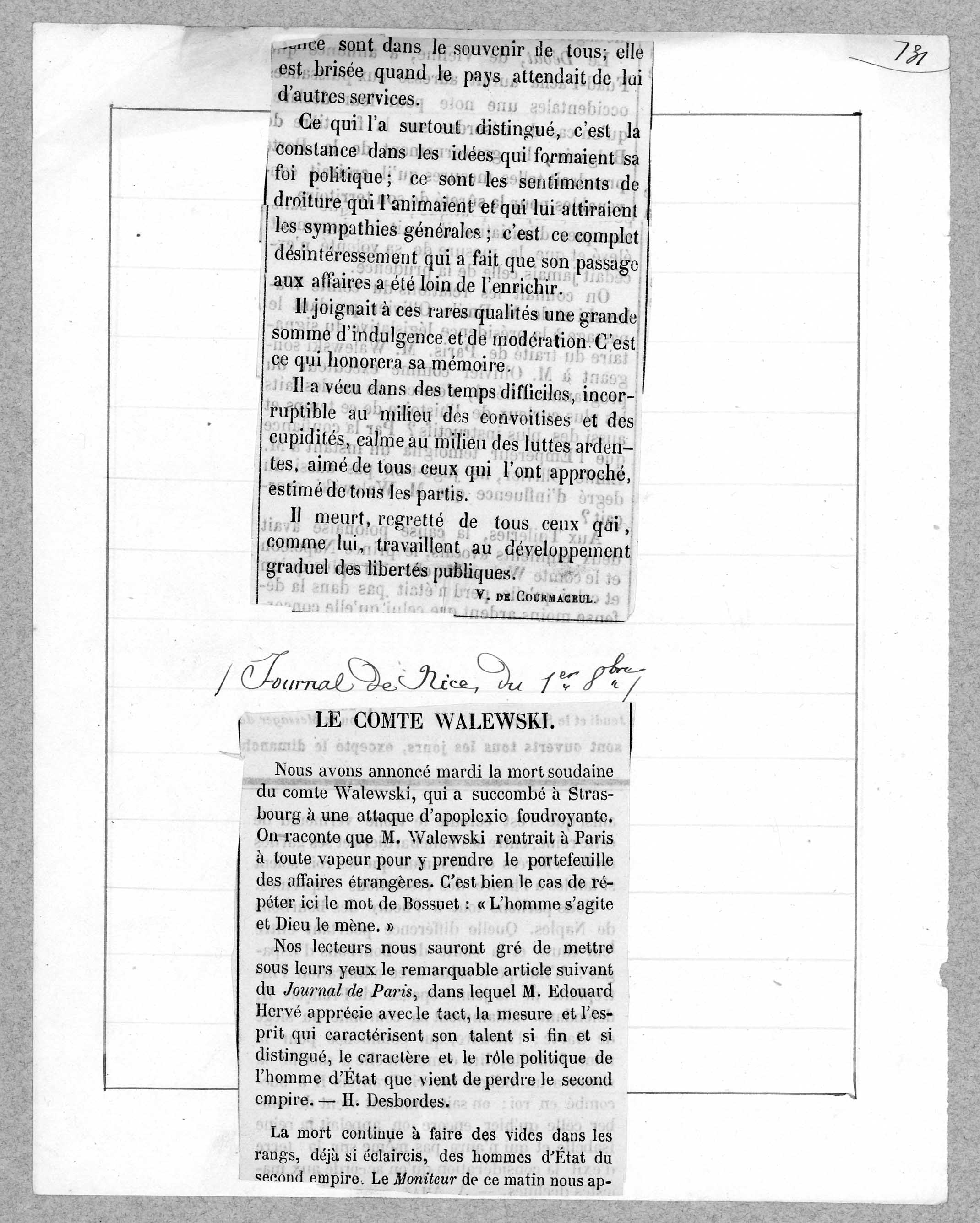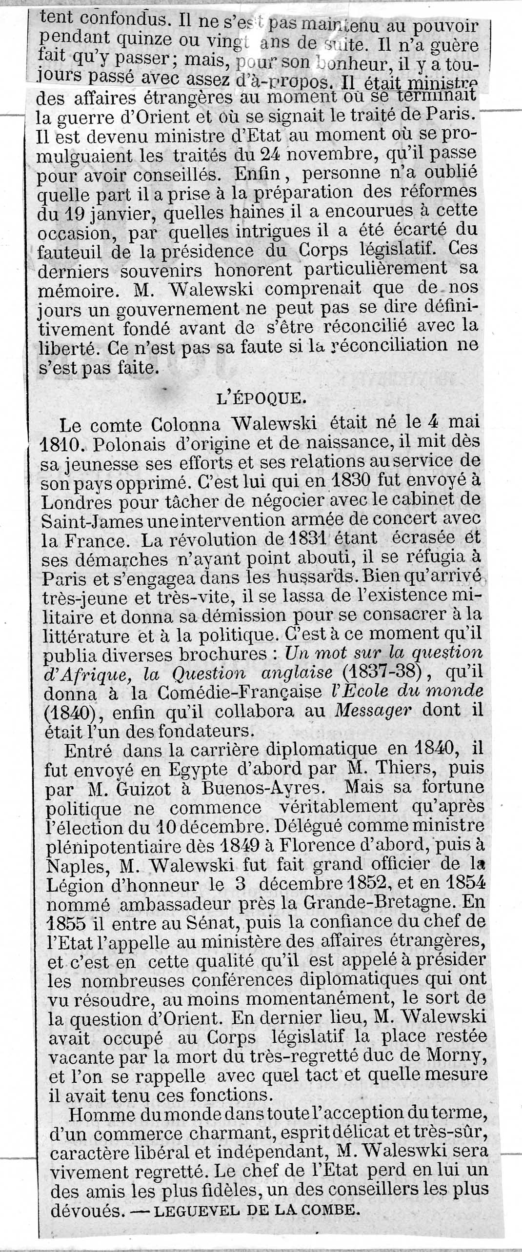 Revue de presse après le décès du Comte Colonna Walewski le 27 septembre 1868 à Strasbourg.